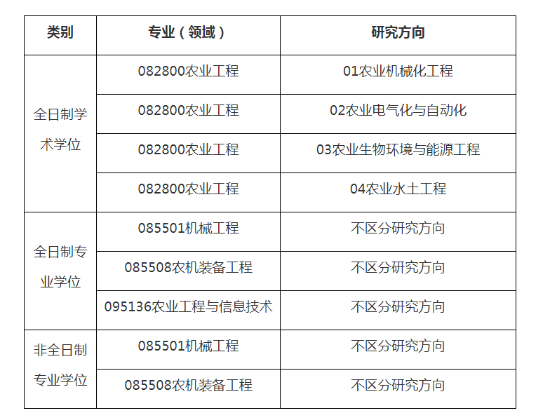 3.调入专业与第一志愿报考专业相同或相近,应在同一学科门类范围内(其中申请调剂082800“农业工程”学术学位和申请调剂“085501机械工程”和“085508农机装备工程”专业学位的调剂专业代码前2位须相同,申请调剂095136“农业工程与信息技术”专业学位的调剂专业代码须完全相同)。