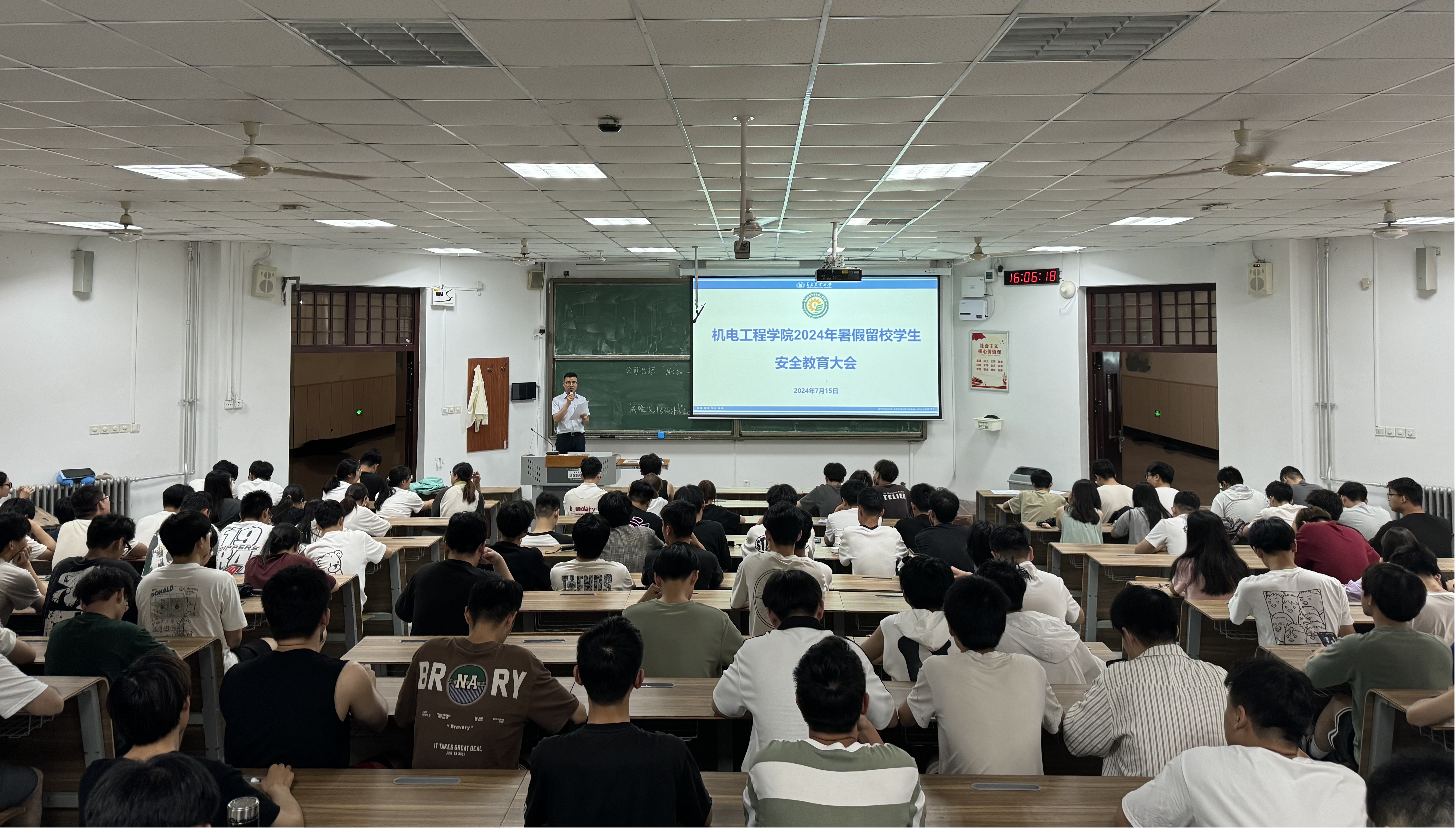 会上,辅导员宣读《2024年暑假留校员工工作安排》,向同学们详细介绍了留校期间的管理规定,重点围绕宿舍安排、晚点名制度、请假审批制度等规定做了解读,提醒留校同学要严格遵守校规校纪,营造和谐、健康、安全的宿舍氛围。随后,辅导员从暑期留校安全、员工公寓安全、防自然灾害安全、交通安全等六大方面对暑期留校员工进行了安全主题教育和纪律教育,并提醒暑期留校员工干部发挥先锋模范作用,多加关注在校生情况,杜绝各类安全隐患。与会同学纷纷表示留校期间将严格遵守校纪校规,认真完成各项既定学习、科研目标,度过一个平安、充实而有意义的暑假。