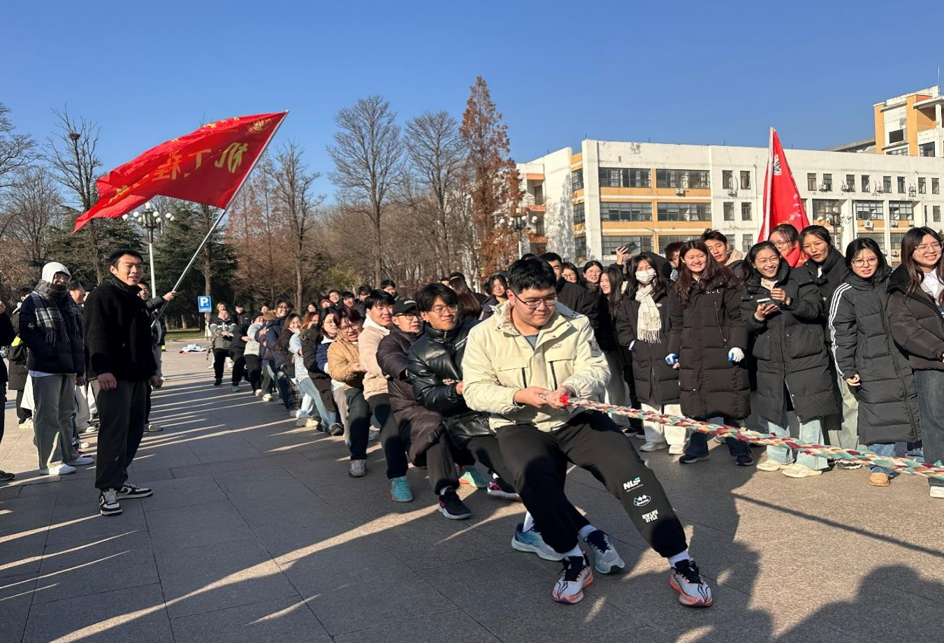 冬意渐浓,虹子广场却热闹非凡。比赛开始前,队员们认真地进行热身运动,活动筋骨,调整状态,为即将到来的比赛做足准备。随着裁判一声哨响,比赛正式开始。队员们迅速紧握麻绳,身体后倾,双脚如同生了根一般牢牢蹬地,齐声呼喊着口号,齐心协力地用力拉绳。比赛中,战况激烈。队员们齐心协力,将比赛推向高潮。一旁的观众们也不甘示弱,他们热情高涨地为自己支持的队伍呐喊助威。“加油!加油!”的呼喊声此起彼伏,仿佛要冲破云霄。最终,伟德国际1946代表队凭借顽强的毅力和强大的团队力量,赢得了比赛。