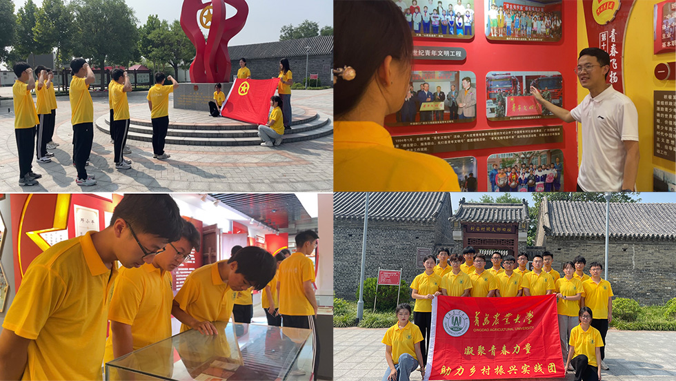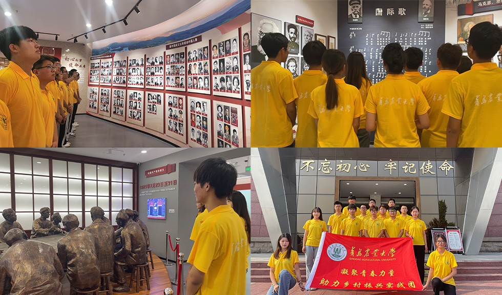 实地研学,感悟真理力量。7月15日,实践团先后赴广饶县刘集后村《共产党宣言》陈列馆、中共刘集支部旧址、广饶县封庙村团支部旧址纪念馆参观学习。在《共产党宣言》陈列馆,队员们沿着《共产党宣言》的诞生、传播、实践、影响、传承发展的主线,详细了解了我国首版《共产党宣言》中文全译本在广饶传播、使用和保存的艰辛历程,并齐唱《国际歌》颂扬革命先烈们不屈不挠的革命斗争精神。在中共刘集支部旧址,队员们详细了解全国最早的农村党支部之一刘集党支部广泛开展革命宣传活动,领导农民群众开展“觅汉增资”“短工增资”和“砸木行”的英勇事迹,并沉浸式地体验了农村地下革命工作“推碾磨”“挖暗门”“藏地道”等形式,使队员们切实感受到革命先烈不怕牺牲、不屈不挠、奋勇抗争的革命精神。在山东省最早的农村团支部——封庙村团支部旧址纪念馆,队员们先后参观了团支部旧址、团史展馆、任杰故居,重温了共青团发展的百年历史,了解了广饶县封庙村进步青年成立团支部等本地优秀革命故事。最后,全体成员在五四主题广场前重温入团誓词。团队成员纷纷表示,作为农科院校学子,应积极把“爱党爱国爱农情怀”种于心中,以青年之拼搏奋斗为加快推进农业农村现代化,全面建设社会主义现代化国家贡献青春力量。