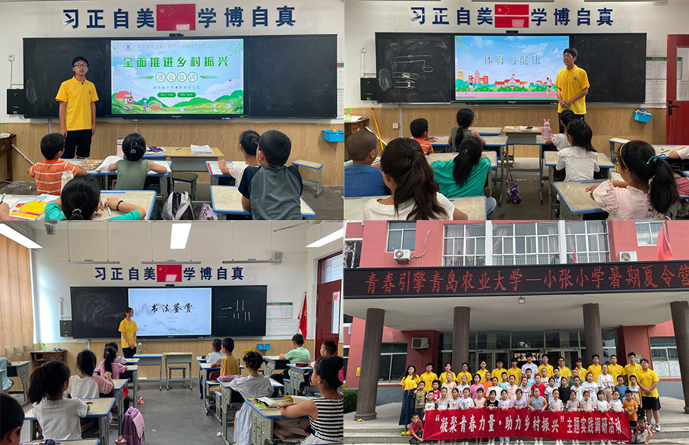 志愿服务,赋能乡村振兴。为积极响应国家乡村振兴战略,推动乡村教育事业发展,7月16日—31日,实践团赴东营市广饶县李鹊镇小张小学开展暑期乡村主题夏令营活动,50余名农村青少年报名参与夏令营活动。16日,实践团15名成员到达小张小学后,指导教师刘孟杰组织召开社会实践工作部署会,专题部署夏令营课程设计、学员管理等方面工作。随后,实践团根据前期家长见面会需求调研基于社会生态模型设计出涵盖田间乡野探索、乡村文化体验、科技创新实践、生命安全教育等方面的夏令营课程。在乡村振兴主题微课堂上,志愿者通过动画视频、趣味问答详细讲解了乡村振兴战略的重要意义与内涵。在红色音乐鉴赏课,志愿者带领全体学员学唱了《我和我的祖国》《歌唱祖国》,重温红色旋律,汲取奋进力量。在科创实践小课堂上,志愿者详细介绍了电磁小火车原理,带领青少年动手制作电磁小火车,不断提升科创实践能力。在青少年自护教育专题培训课上,志愿者以防火用电为主题,带领青少年学习火场逃生等自救知识,教导青少年认识用电安全标识以及如何安全用电。在夏令营结营仪式上,小张小学董事长刘俊表示本次夏令营的成功举办是家校社协同育人的结果,志愿者老师秉承“奉献、友爱、互助、进步”的志愿服务精神,以志愿行动助力乡村振兴,不断推动农村青少年在价值观念、艺术审美、文学素养、心理素质等多方面实现赋能成长。
