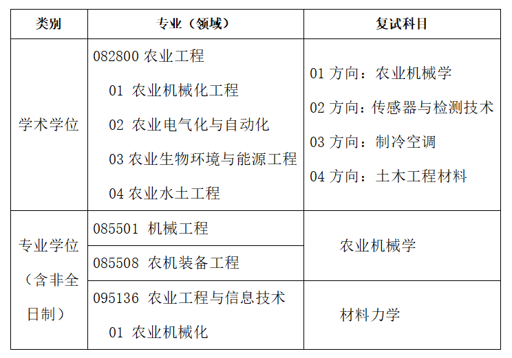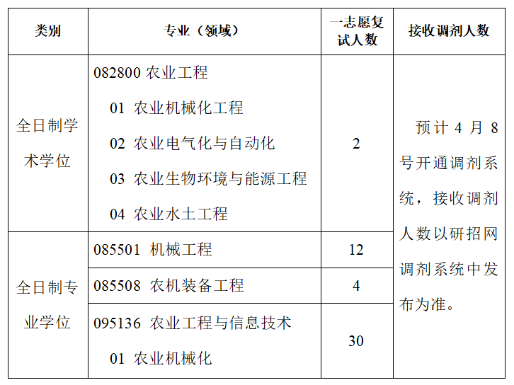(3)申请调剂095136农业工程与信息技术专业学位的专业代码须完全相同且为农业机械化方向。